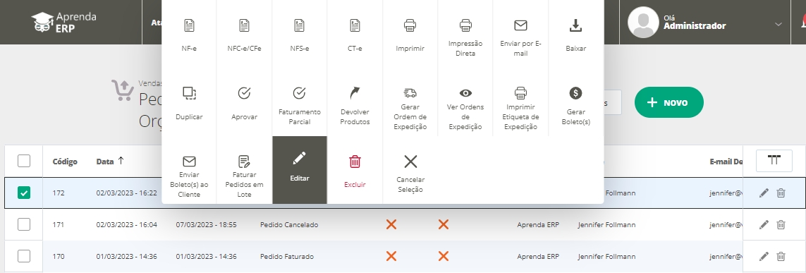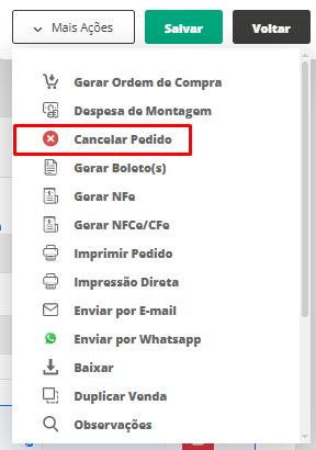 - Através do menu lateral Vendas, submenu Pedidos e Orçamentos. Nesta página, edite a venda, clique em Mais Ações e selecione a opção Cancelar Pedido.
