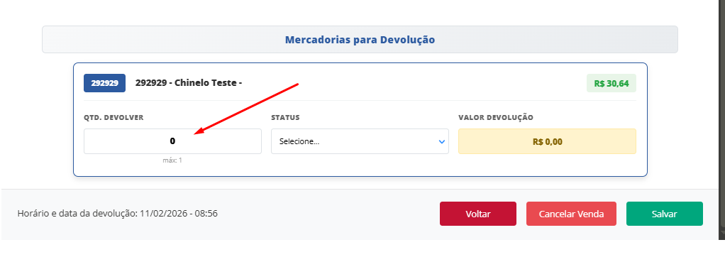 Em seguida, você irá informar a quantidade a ser devolvida dos itens e então irá clicar em cancelar venda