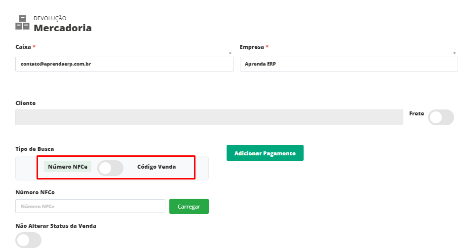 Todas as opções levarão você para a mesma tela de Devolução de mercadorias, onde é necessário informar o Número da NFC-e ou o Código da Venda