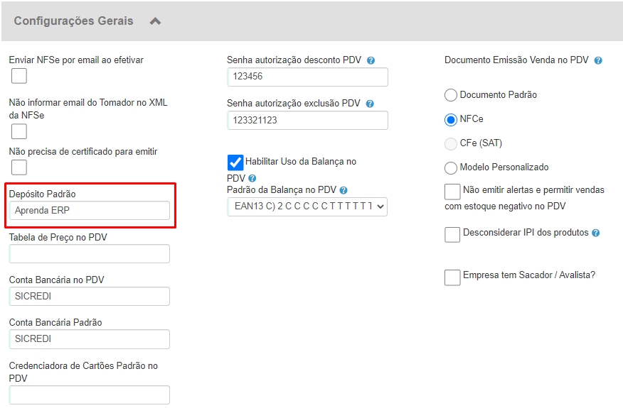 Depósito no PDV: neste campo, defina de qual depósito devem ser retirados os produtos que o usuário vender pelo PDV;