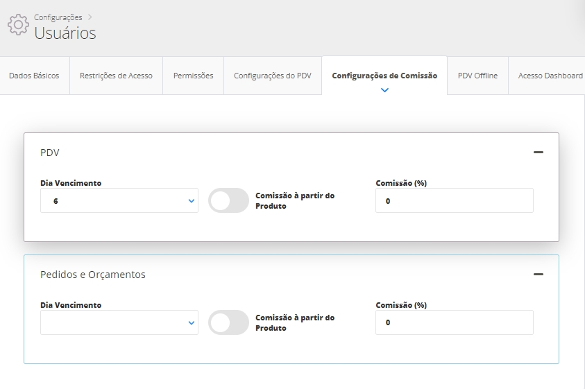 Comissão à partir do Produto: habilite esta opção para determinar que o valor da comissão deste usuário será calculado a partir do valor informado no cadastro do produto quando o usuário fizer uma venda.