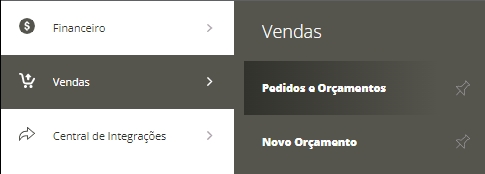 Para isso, primeiramente será necessário acessar o menu lateral Vendas, submenu Pedidos e Orçamento.