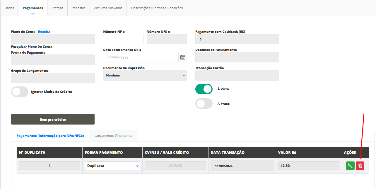 Logo, será necessário clicar na aba Pagamentos. Depois disso, clique no ícone da lixeira para deletar os registros.