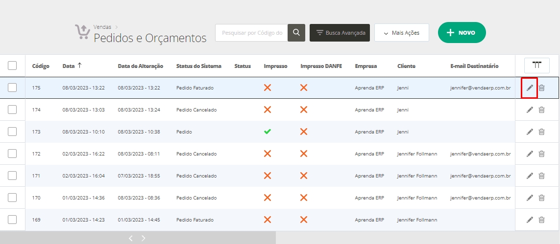 A outra forma de gerar a NFC-e de vendas realizadas por Orçamento/Pedidos é através da Edição dessa venda. Para isso, ainda na tela de listagem de Pedidos e Orçamentos, clique no ícone de lápis para editá-la.