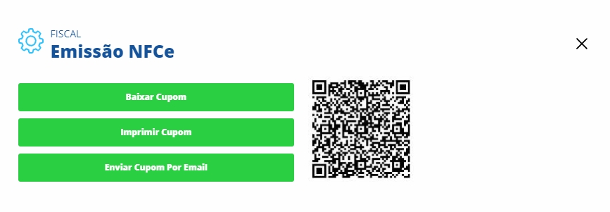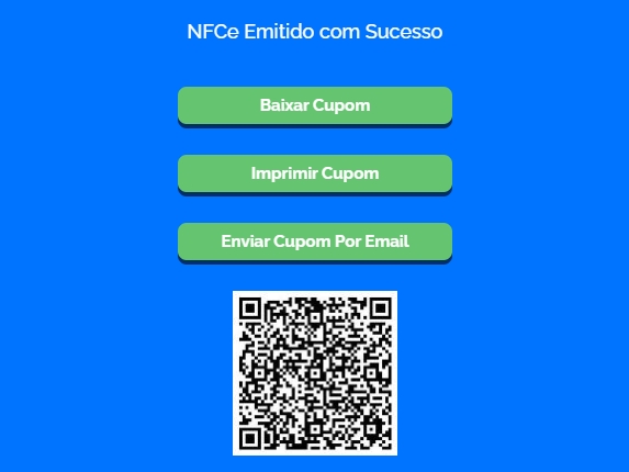 Logo após, o sistema informará que a NFC-e foi emitida com sucesso e você poderá Baixar o Cupom, Imprimir Cupom ou Enviar Cupom por E-mail.