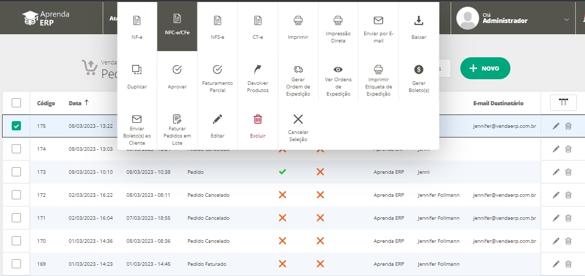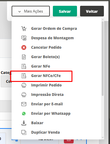 Com o pedido editado, você precisará clicar em Mais Ações e na sequência, em Gerar NFC-e.