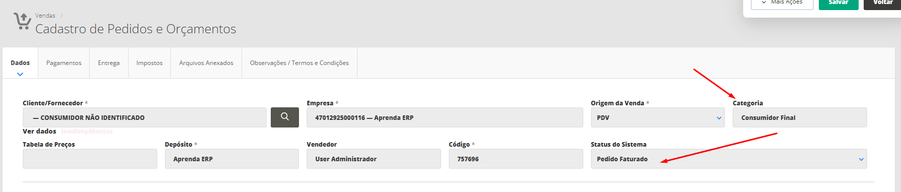 Neste momento, o sistema apresentará a listagem de todos os pedidos gerados em seu sistema. Lembrando que para gerar uma NFC-e, o seu pedido deve estar faturado no sistema, e no campo Categoria da venda, deverá ser informada a categoria Consumidor Final (que é a categoria padrão para as NFC-es) ou uma categoria que possui a operação fiscal cadastrada de forma correta para a emissão de NFC-e.