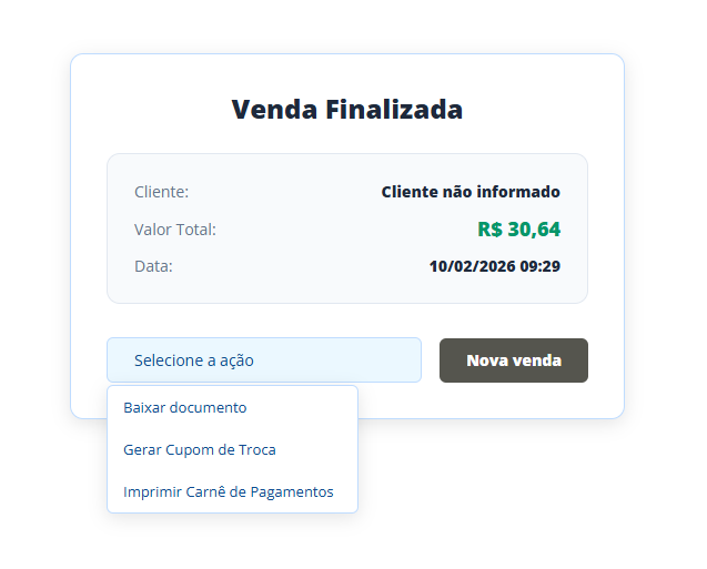 Na próxima tela, o sistema irá finalizar a venda. Agora, clique no botão Selecione a Ação e selecione a opção que mais lhe atender, seja cupom nao fiscal ou o cupom fiscal para impressão.