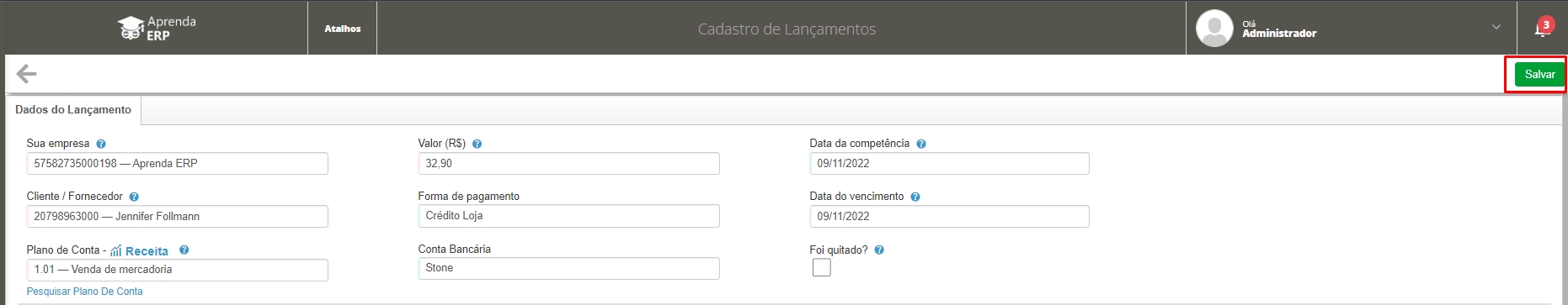 Onde o sistema irá lhe direcionar a tela de cadastro de lançamento. Onde verifique se os dados estão de acordo e clique em salvar.