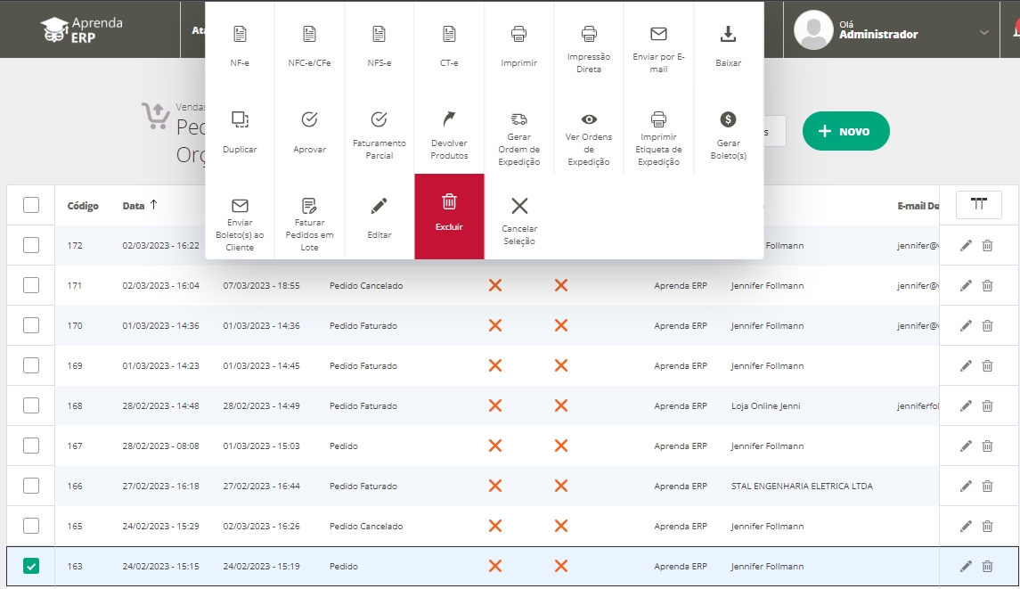 Agora, selecione o pedido desejado e clique na opção Excluir.