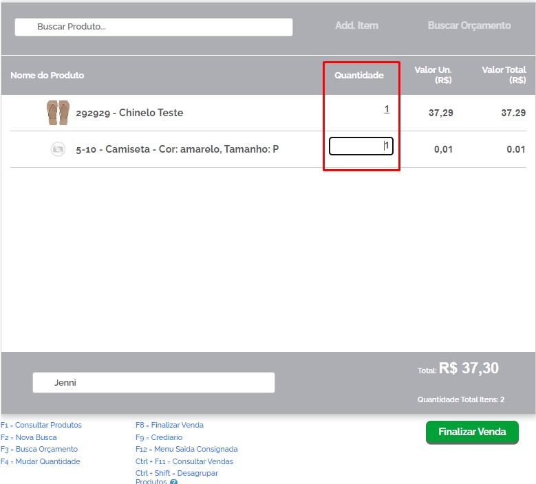 Agora, com o seu caixa aberto e na tela do PDV, verifique as informações. Caso queira alterar a quantidade e o valor da unidade, basta clicar no campo Quantidade ou Valor Un. (R$) de cada item.