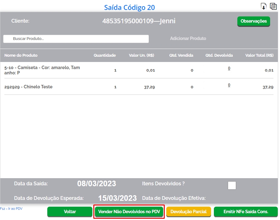 Na próxima tela, clique no botão Vender Não Devolvidos no PDV. Feito isso, o sistema irá redirecionar você para a tela do PDV para finalizar a venda, basta clicar em OK.