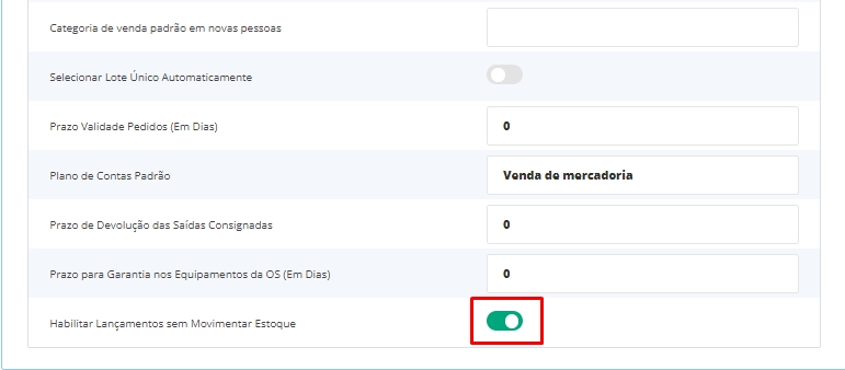 Em seguida expanda a Vendas e marque a opção Habilitar Lançamentos sem Movimentar Estoque e salve as alterações