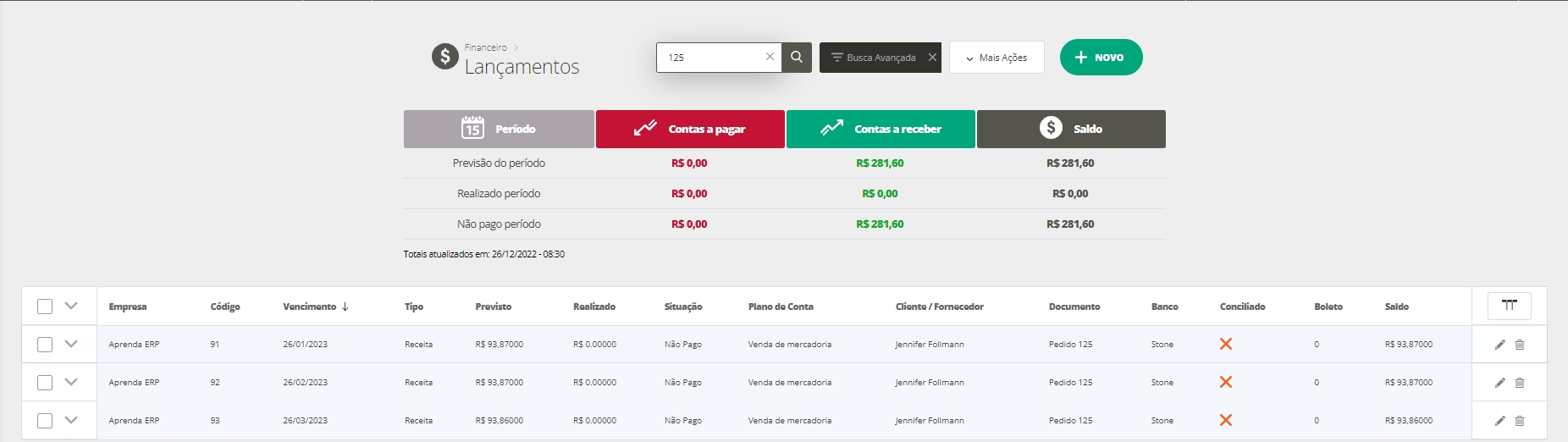 - Os lançamentos financeiros vinculados ao pedido não poderão ser excluídos, somente todo o pedido.