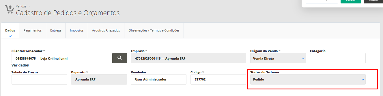 Valide os dados a serem lançados no financeiro e clique em Salvar. Onde, será retornado a tela de edição da venda, e o Status da Venda irá permanecer como Pedido
