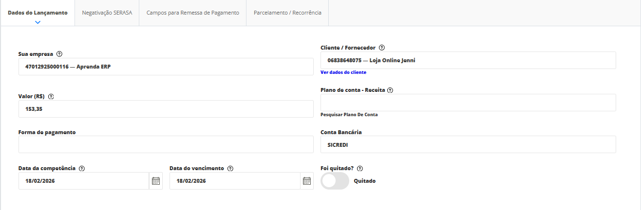 Então, será direcionado a tela de Cadastro de lançamentos, para que as informações financeiras sejam cadastradas