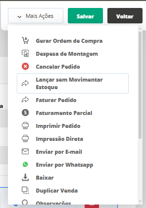 Preenchidos os campos da venda, clique em Salvar e em seguida em Mais ações. Visualize a opção de Lançamentos sem Movimentar Estoque