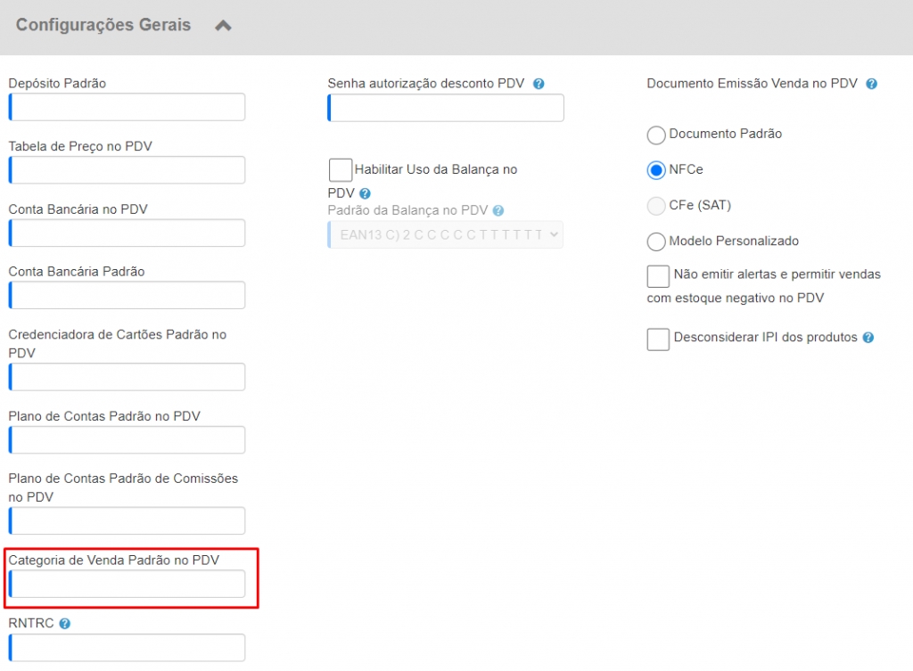 Ao utilizar uma nova categoria, você deverá informá-la (obrigatoriamente) no campo Categoria de Venda Padrão no PDV no cadastro da empresa, assim o sistema puxará as tributações cadastradas. Caso não seja informada, o sistema puxará as tributações da categoria Consumidor Final (caso não tenha preenchido nenhuma informação sobre os impostos o sistema utilizará as informações padrão).
