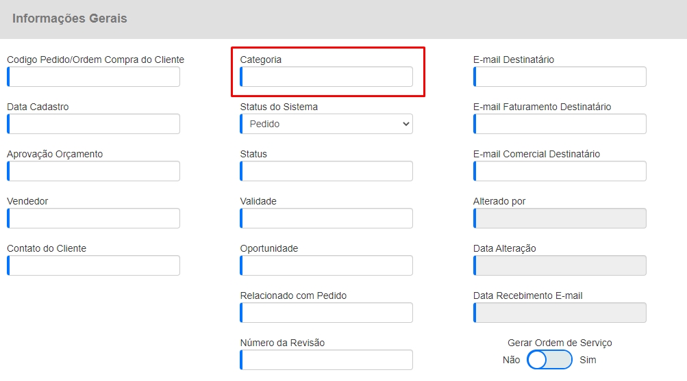 Importante! Ao deixar o campo Categoria no pedido/orçamento em branco, o sistema preencherá automaticamente com a categoria padrão Venda de Materiais e Serviços. Assim, caso você não tenha configurado as tributações nesta categoria, o sistema puxará informações padrão visto que não foi informada outra categoria.