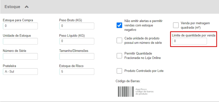 Dentro do cadastro do produto, na seção Estoque, você poderá informar a quantidade limitada por venda no campo Limite de quantidade por venda.
