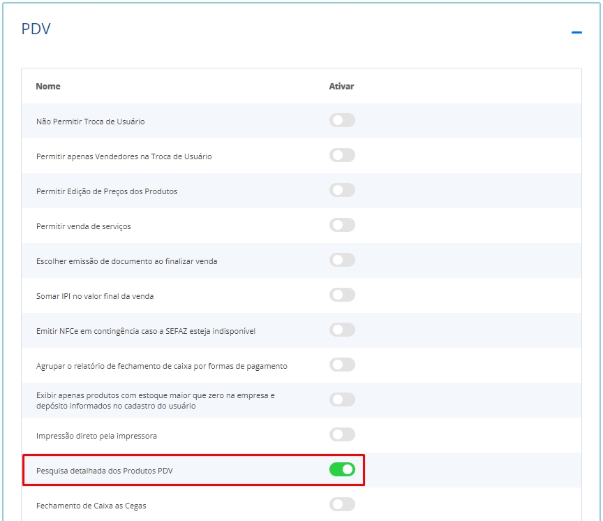 Para configurar o detalhamento, basta acessar o menu lateral Configurações, submenu Configurações do ERP e expandir a aba PDV. Nesse momento, habilite a opção Pesquisa detalhada dos Produtos PDV.