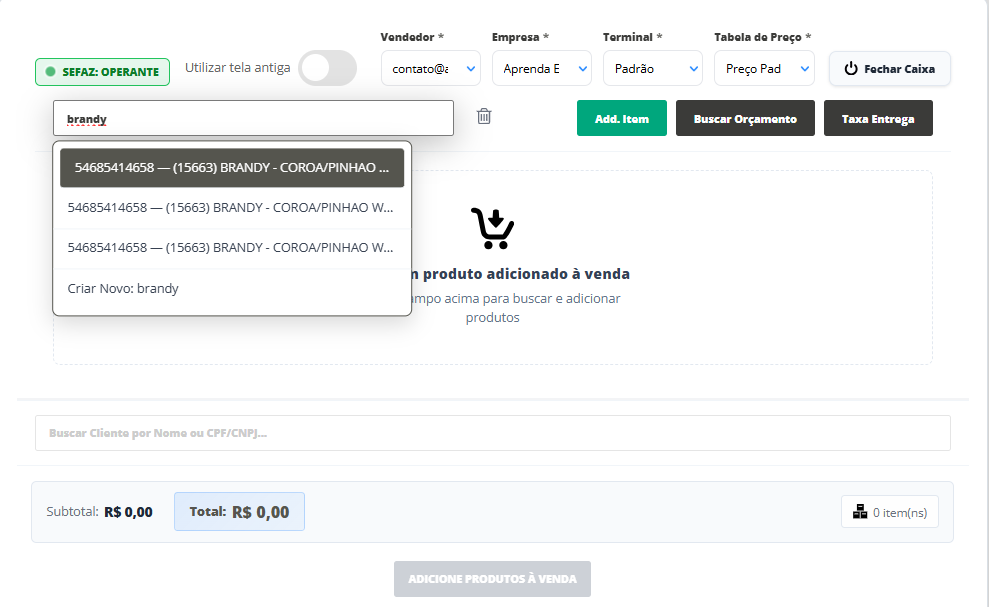 Basta informar uma palavra que conste no nome do produto, como por exemplo Brandy, e o sistema apresentará todos os produtos que possuem o nome informado.