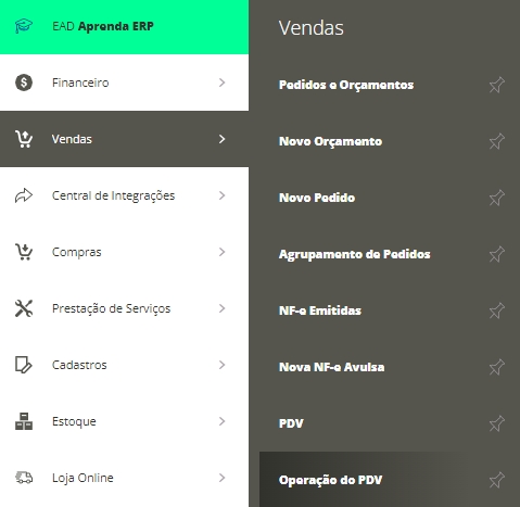 Para realizar as devoluções, você vai acessar o menu lateral Vendas, e submenu Operação do PDV
