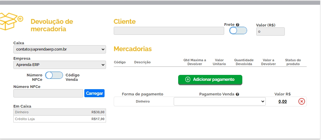 Caixa: informe o caixa responsável pela devolução, o caixa sempre estará com o e-mail dos vendedores.
