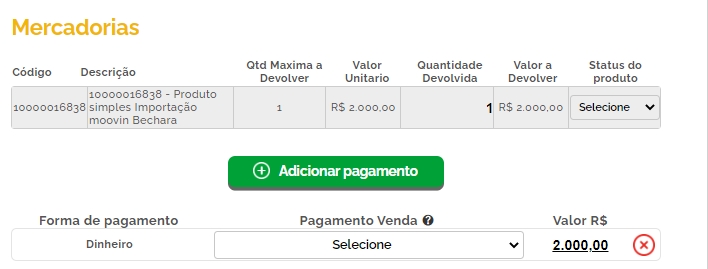 Em seguida, informe a quantidade de produtos a ser devolvida pelo cliente, e também selecione a forma de pagamento que será utilizada nesta devolução.