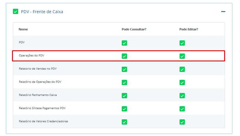 Na aba de Permissões, busque por PDV Frente de Caixa e verifique se a opção Operações do PDV está marcada.