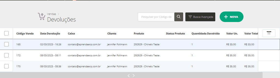 Se abrirá uma tela onde são exibidas todas as devoluções já realizadas na sua licença.