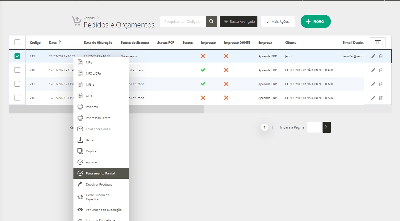 Feito isso, aparecerá a listagem com todos os seus pedidos e orçamentos. Nesta etapa, selecione qual pedido deverá ser faturado parcialmente.