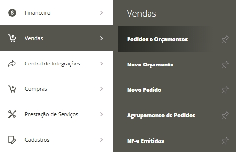 Para realizar esta ação, acesse o menu lateral Vendas, submenu Pedidos e Orçamentos.