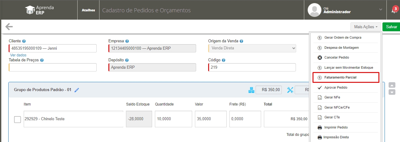 Edite um pedido e no Mais Ações, clique em Faturamento Parcial.
