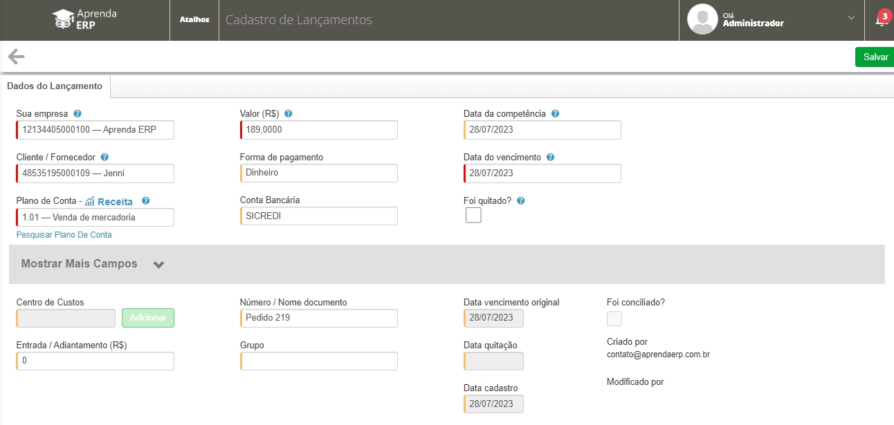 Então, você será direcionado para a tela de Cadastro de Lançamentos, onde é possível verificar os dados ou adicionar outras informações. Feito isso, clique em Salvar.