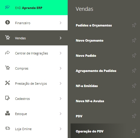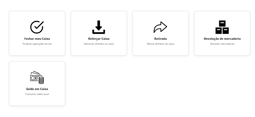 Após acessar as operações do PDV, estará disponível a você como padrão do sistema, 4 menus, sendo eles: