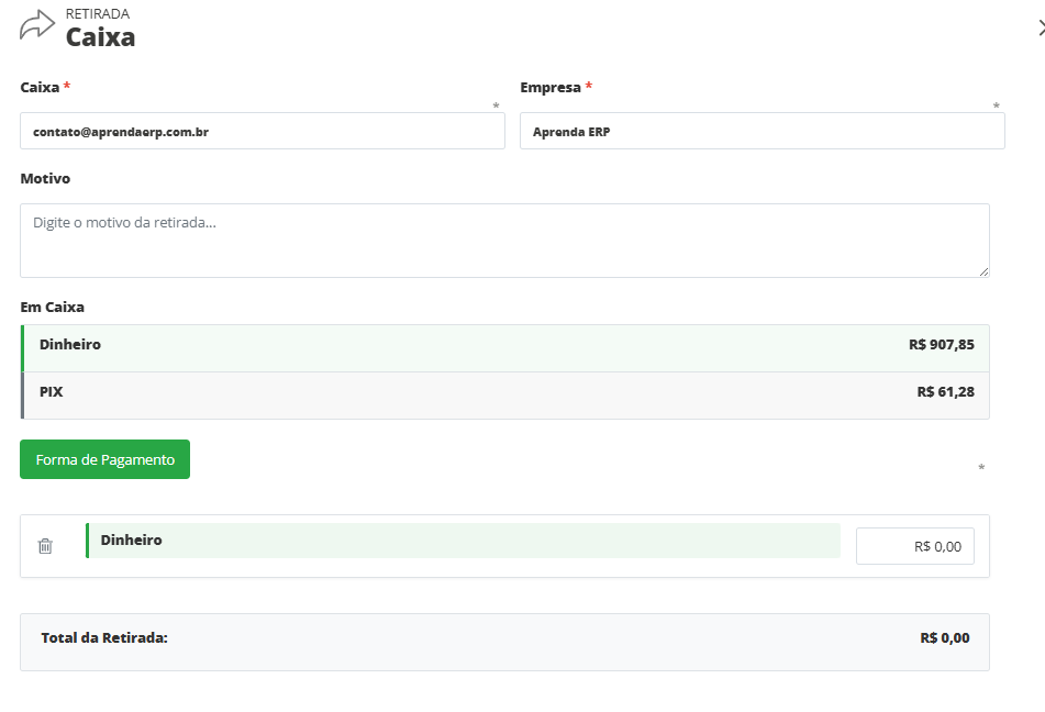ara realizar a Retirada (Sangria de Caixa) corretamente, alguns campos estarão disponíveis para serem preenchidos. São eles: