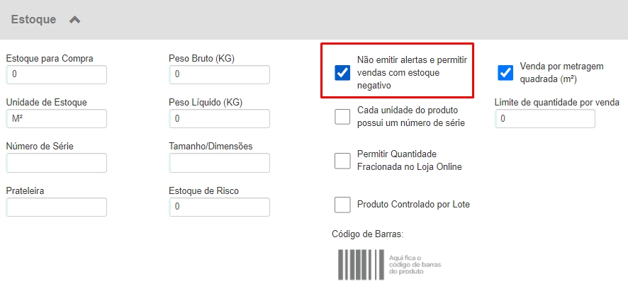 Agora, na tela de edição do cadastro, na aba Dados, vá até a seção Estoque. Nela, você verá a opção Não emitir alertas e permitir vendas com estoque negativo, a qual deverá habilitar. Por fim, clique em Salvar, no topo da tela.