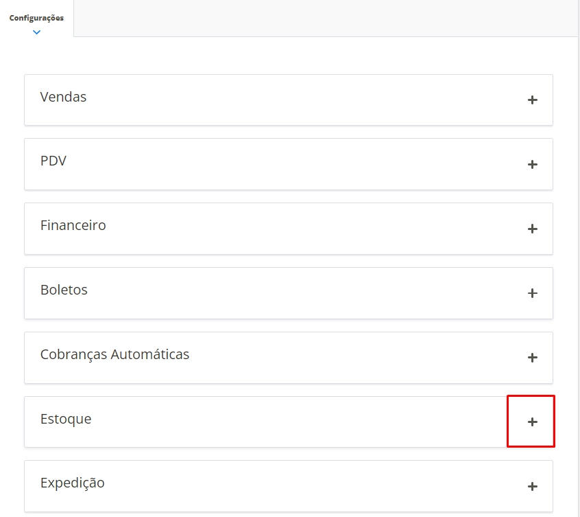 Em seguida, busque pela seção Estoque e expanda clicando no ícone de +.