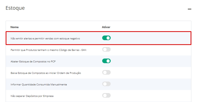 Vale ressaltar que com a habilitação desta configuração, todos os itens passarão a ter autorização para serem comercializados com estoque negativo.