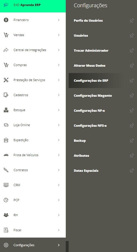 Para isso, acesse o menu lateral Configurações, submenu Configurações do ERP.