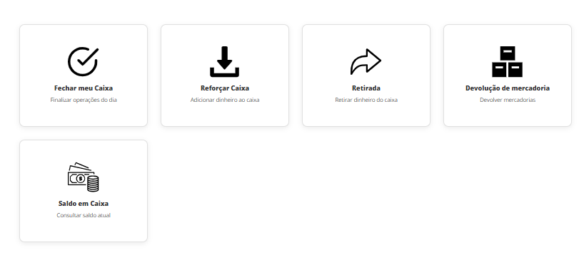 Após acessar as operações do PDV, estará disponível a você como padrão do sistema, 4 menus, sendo eles: