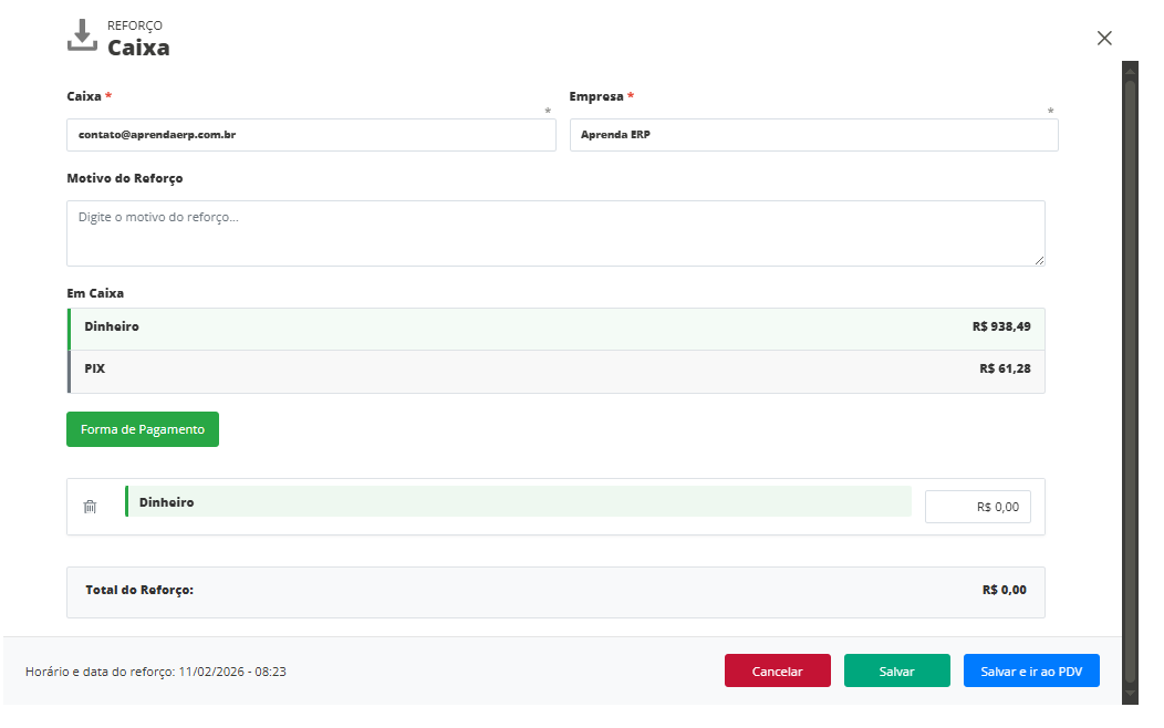 A opção de reforçar o caixa, consiste em adicionar determinados valores ao longo do dia em seu caixa, sempre que necessário.