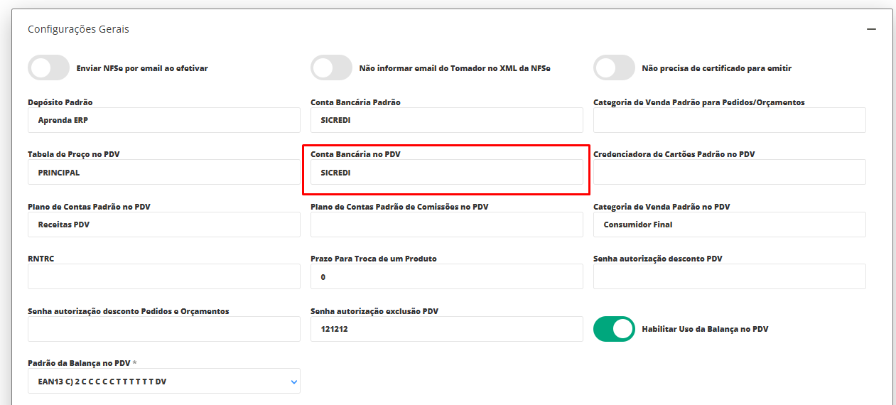 Agora, dentro do cadastro da empresa, vá até a seção Configurações Gerais, onde será possível localizar o campo Conta Bancária no PDV.