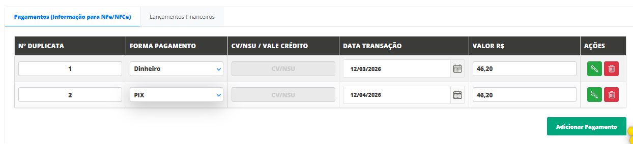 Com as parcelas geradas, em Forma de Pagamento você poderá selecionar as formas de pagamento que deseja e os valores respectivos.
