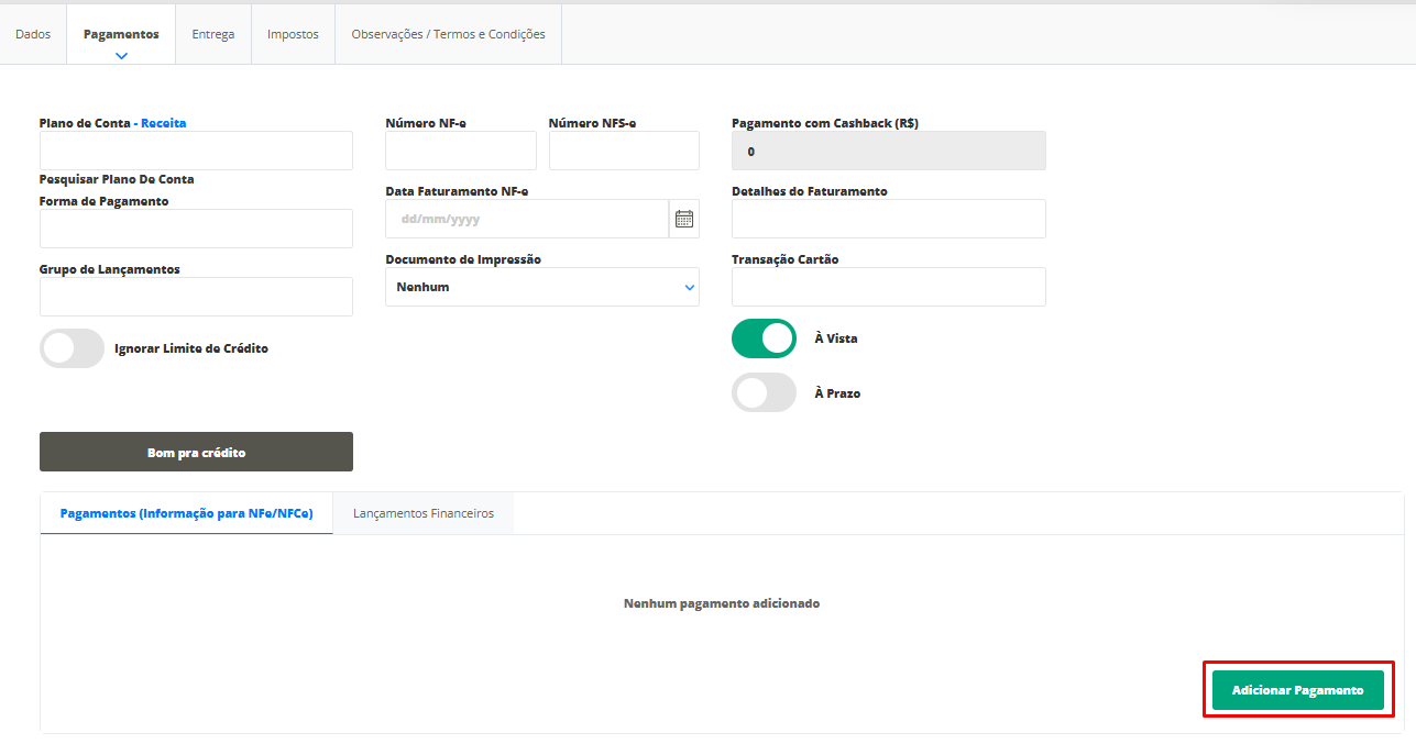 Agora, desça até as Aba Pagamentos e clique em Adicionar Pagamentos.