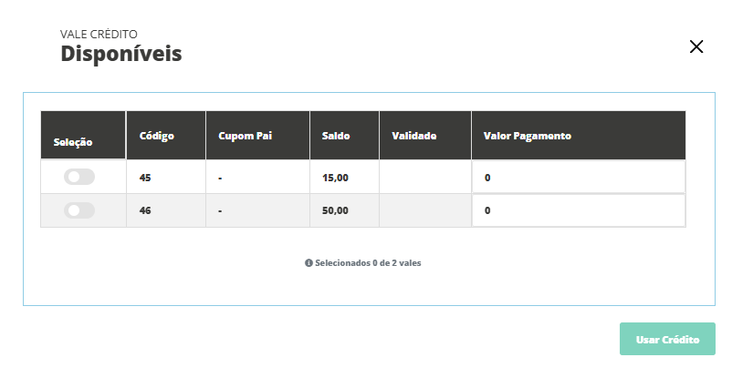 Logo, serão exibidas as informações do vale crédito, onde será possível utilizá-lo de forma integral ou parcial de acordo com a venda, também será necessário marcar o checkbox correspondente ao vale crédito que deseja utilizar, em seguida clique em Usar Crédito.