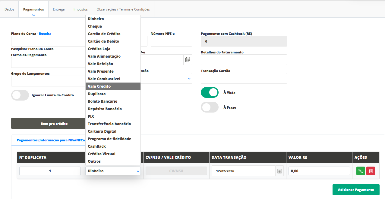 Nesse momento, no campo Forma Pagamento selecione Vale Crédito, assim o sistema apresentará os vales disponíveis para uso.