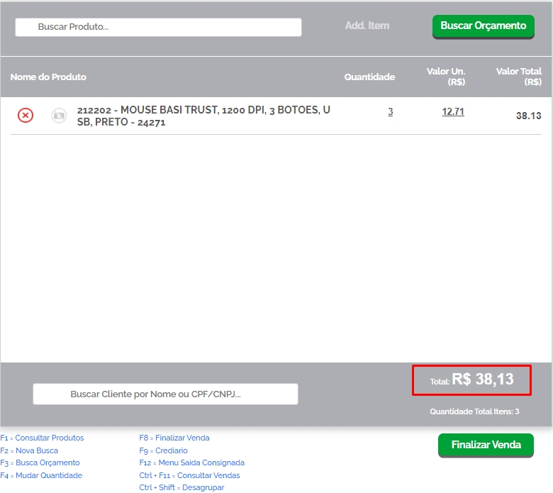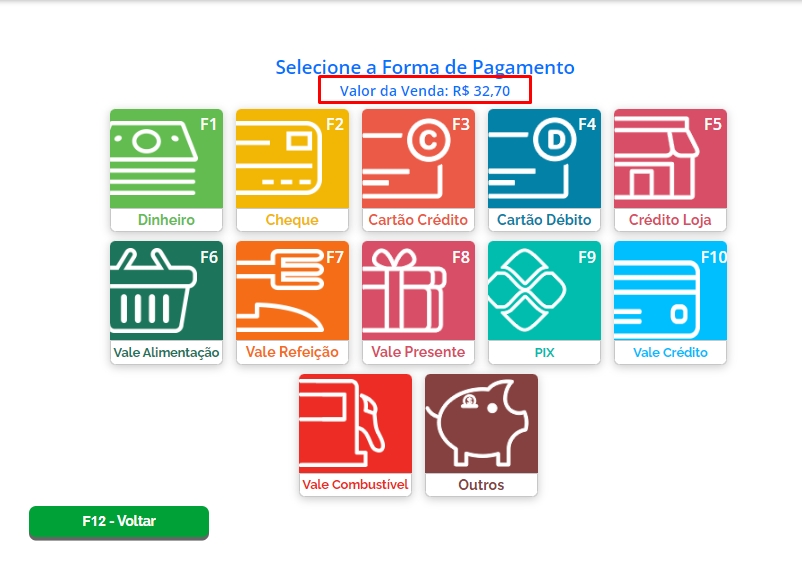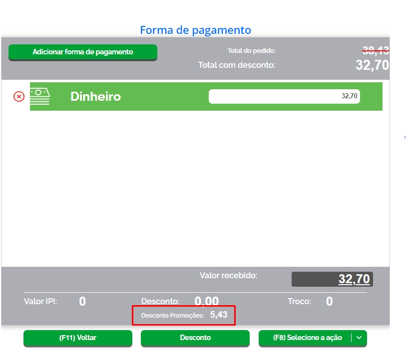 Na primeira tela do PDV, o valor total informado é referente ao preço padrão do produto, sem desconto. Porém, nas telas de escolha de forma de pagamento e de finalização da venda, já estará mencionado o valor final da venda, com o desconto aplicado.