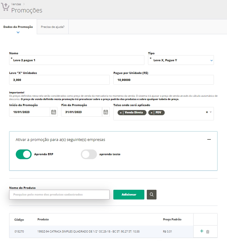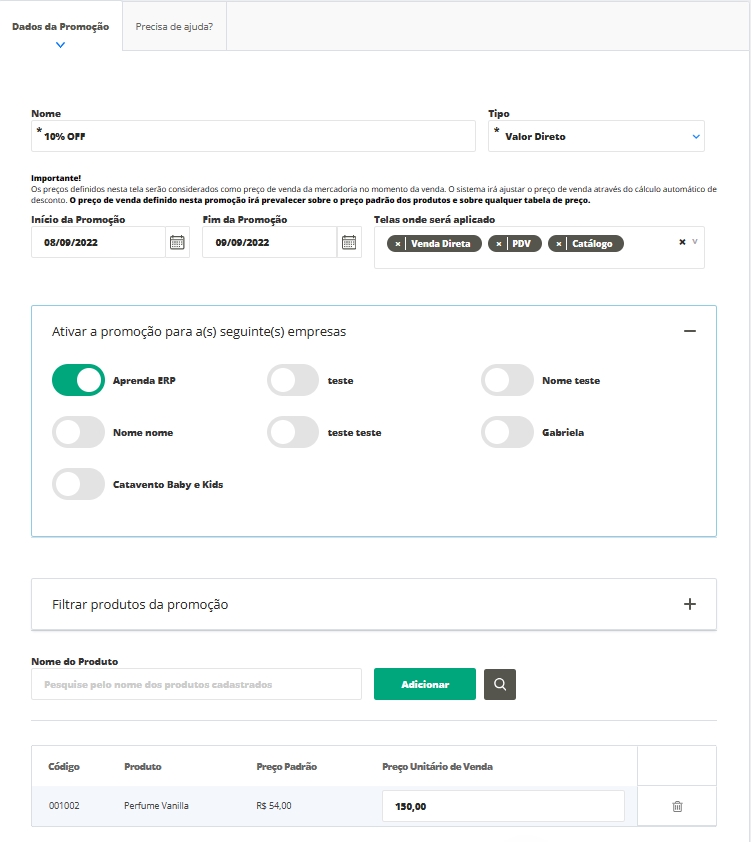 Ativar a promoção para a(s) seguinte(s) empresas: selecione qual empresa será a responsável por realizar vendas com esta promoção.